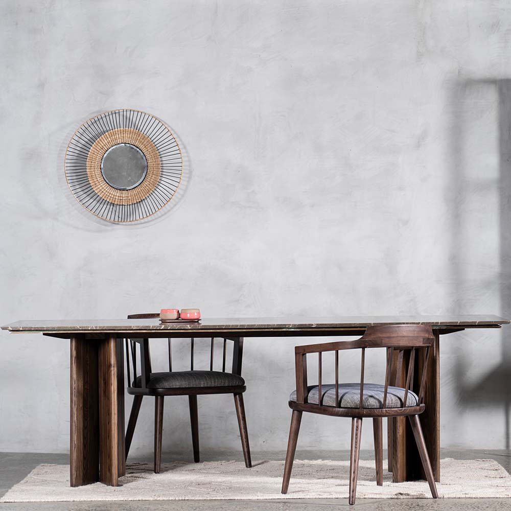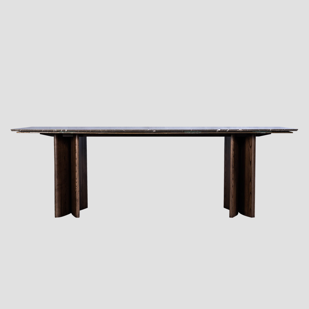 A refined piece featuring sharp edges and precisely crafted corners. Its sleek design is highlighted by uniquely curved legs that face opposite directions, adding a distinctive touch. The slim tabletop enhances its striking appearance, creating a perfect balance of style and craftsmanship